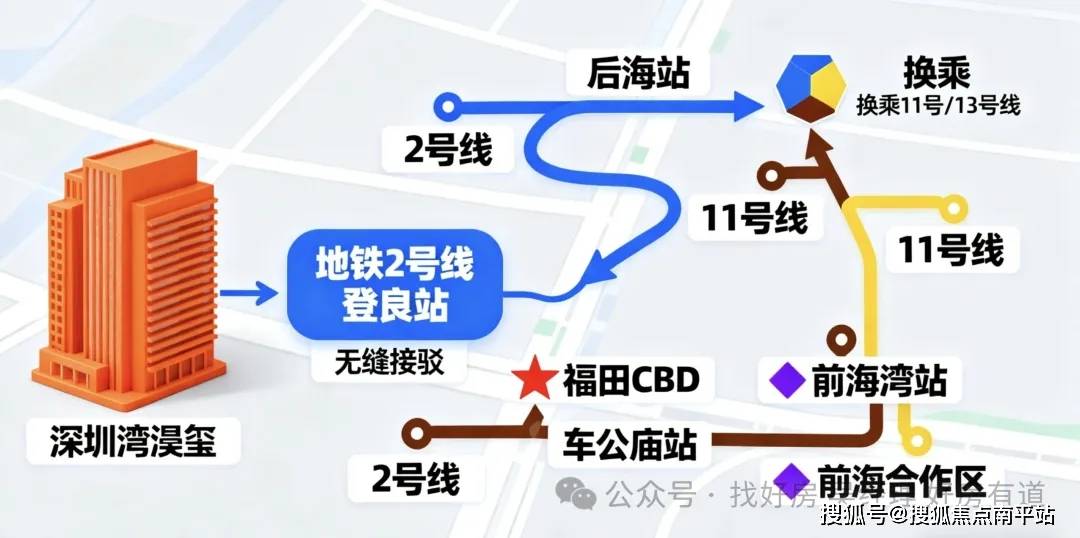 项目无缝接驳地铁2号线号地铁线坐达福田CBD(车公庙坐)、前海合做区(前海湾坐)。